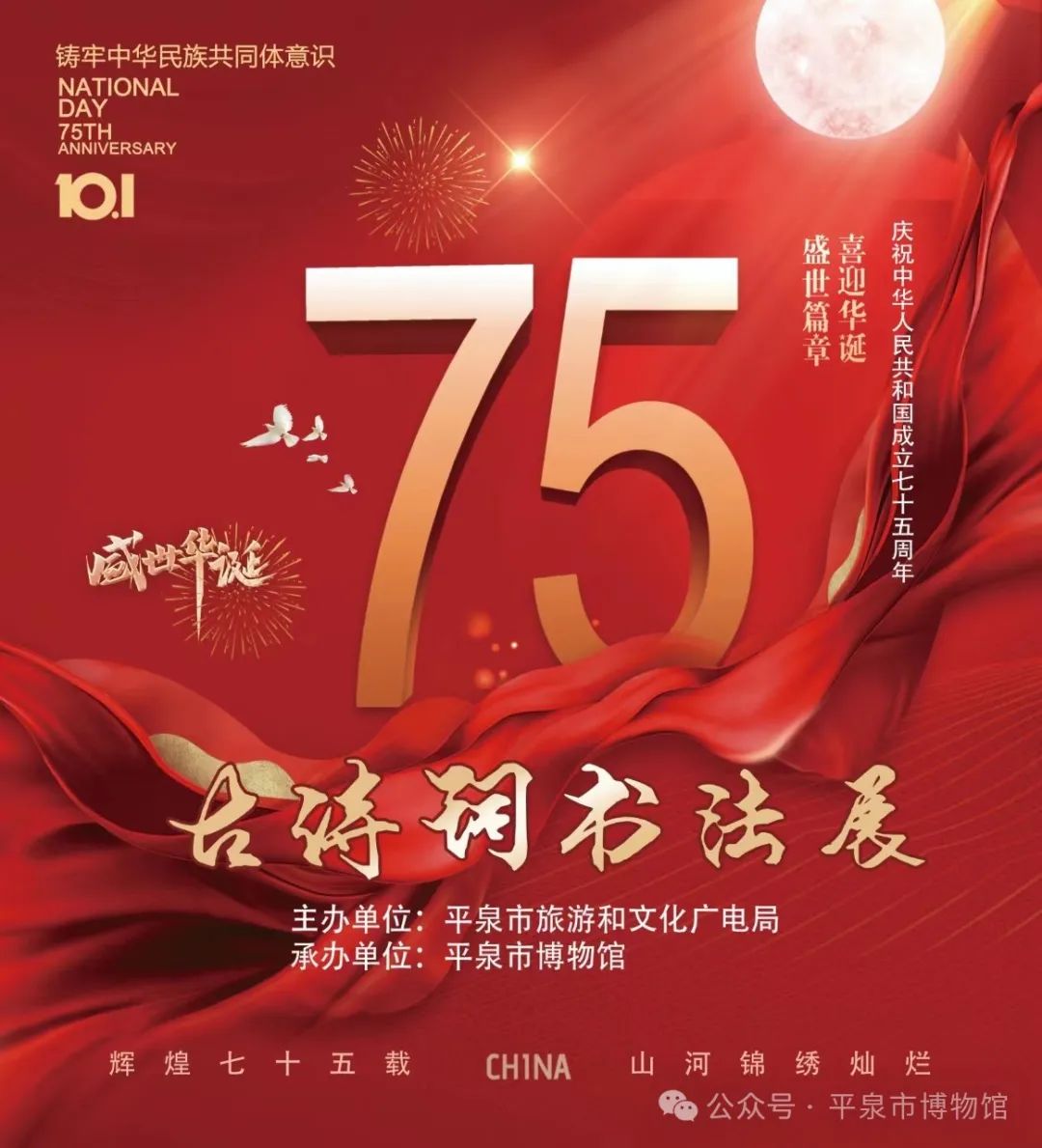 2024年是中华人民共和国成立75周年的伟大时刻。为庆祝这一历史性的纪念日,平泉市博物馆在十一国庆来临之际,特举办——铸牢中华民族共同体意识 | “庆祝中华人民共和国成立75周年”古诗词书法展。