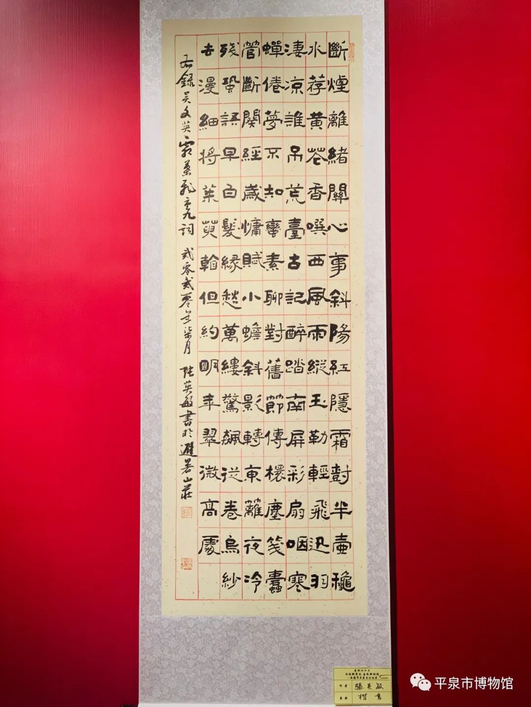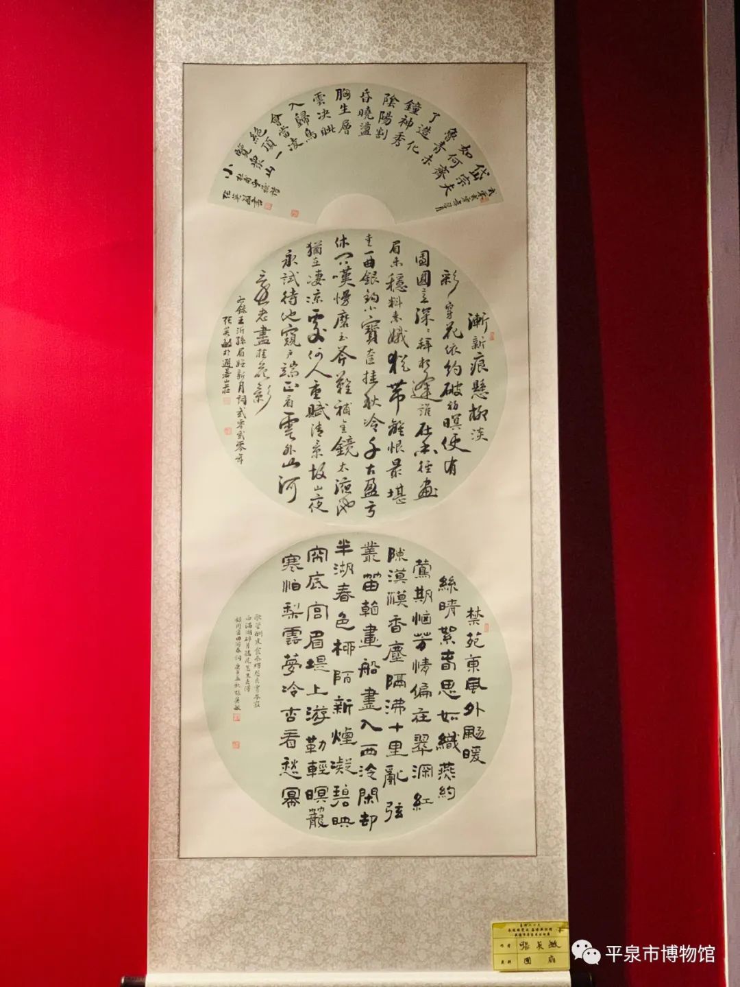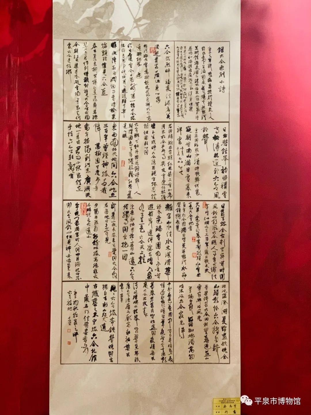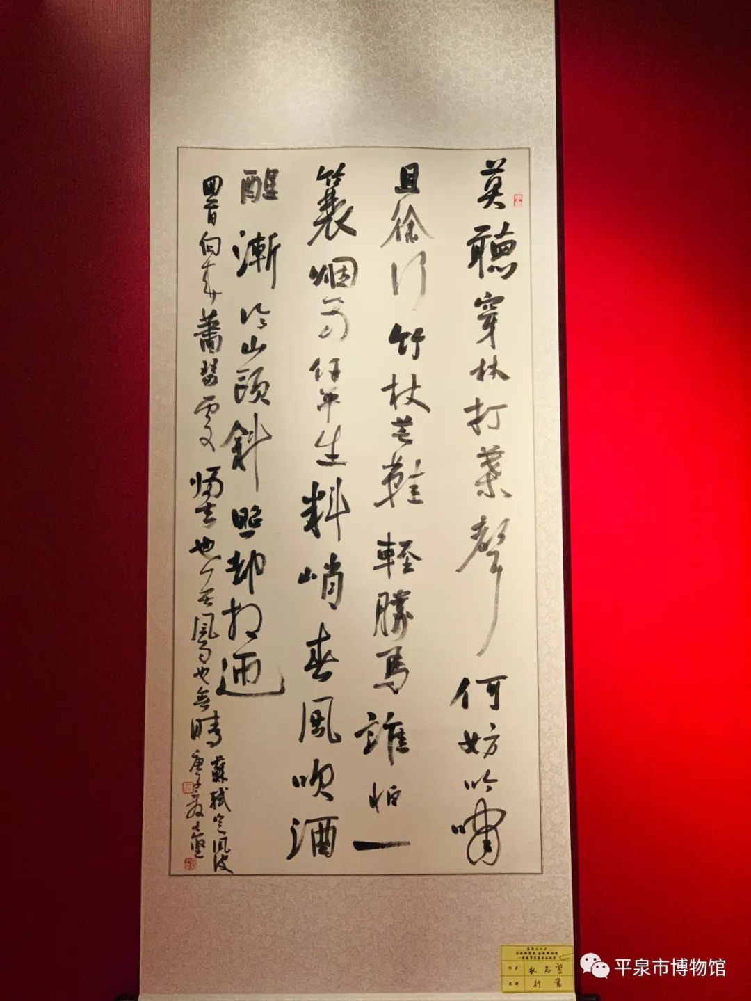 所展作品五十余幅,基本含盖了章,行,楷,隶,篆诸体。作品内容多取中国传统文化中的诗词曲赋以及当代伟人名人之词句,还包括自作诗联等,格调高雅,取向积极,代表了每个书家一定的审美标准。在作品的创作形式上,有条幅,斗方,对联,手札,通景条屏等也基本代表了自己在艺术追求和技术把控上的倾向性。