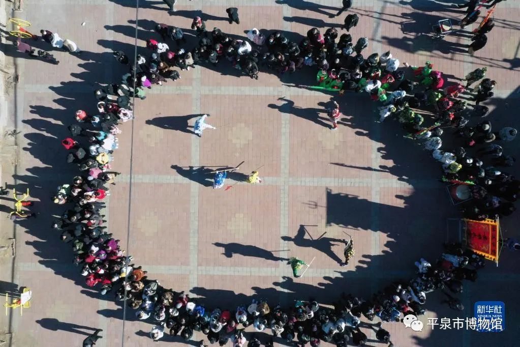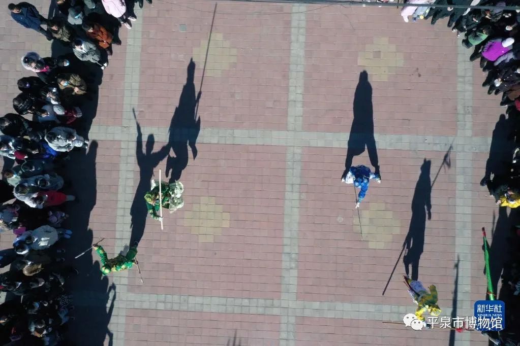 2月4日,在丰宁县黄旗镇黄旗东村文化广场,民间艺人表演“黄旗武会”(无人机照片)。