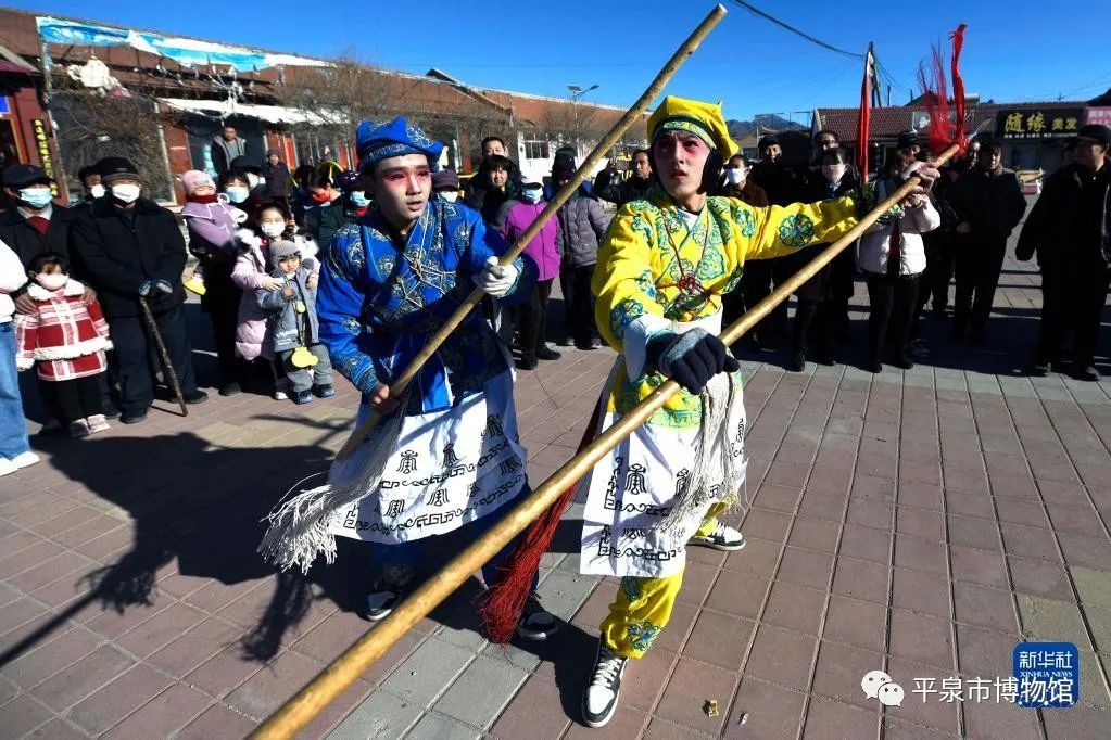2月4日,在丰宁县黄旗镇黄旗东村文化广场,民间艺人表演“黄旗武会”。