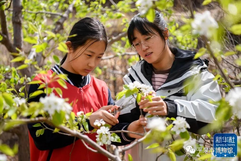 ↑4月21日,承德县新杖子小学学生在老师的指导下学习为梨树梳花。