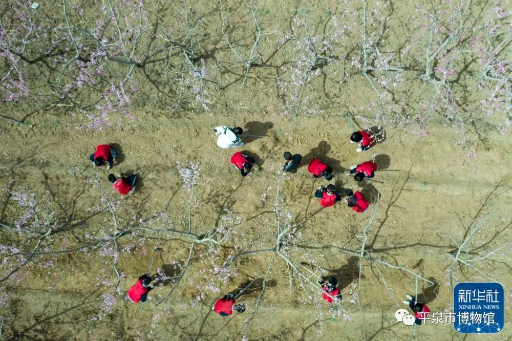 ↑4月21日,承德县新杖子小学学生在桃园锄草(无人机照片)。