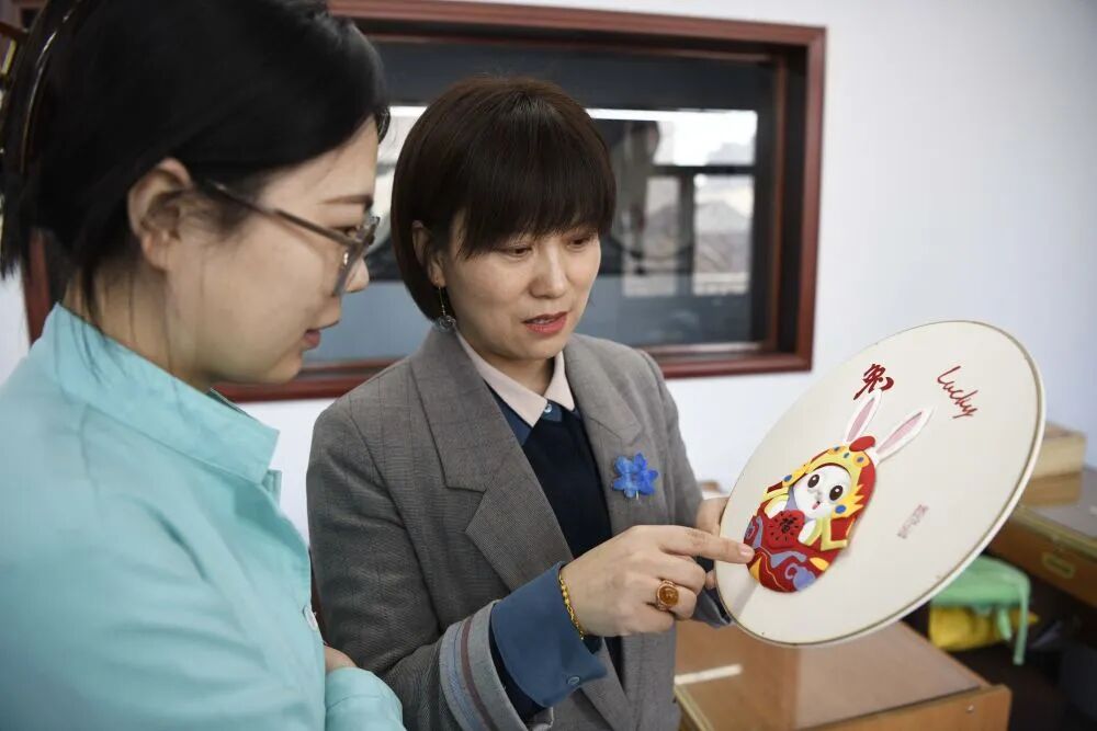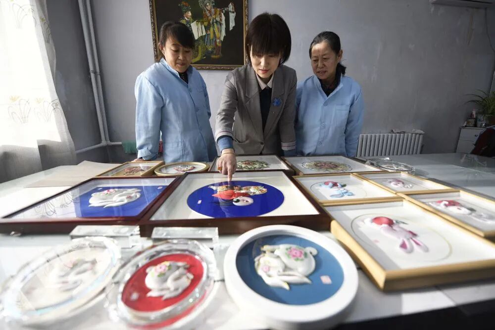 传承人郝如香(中)与手工艺人交流布糊画制作经验。新华社发(王立群 摄)