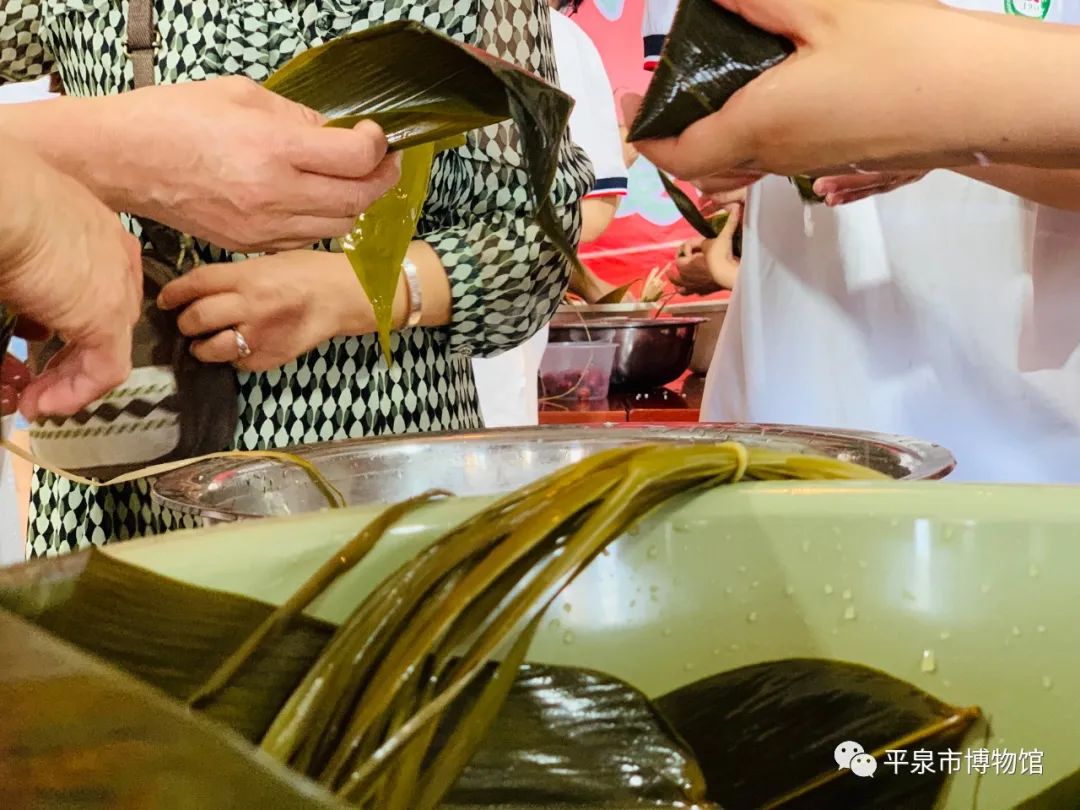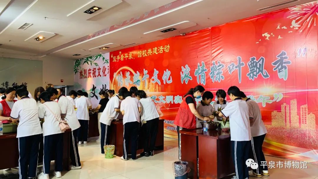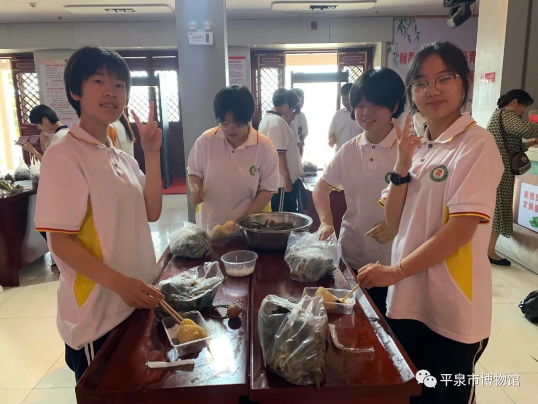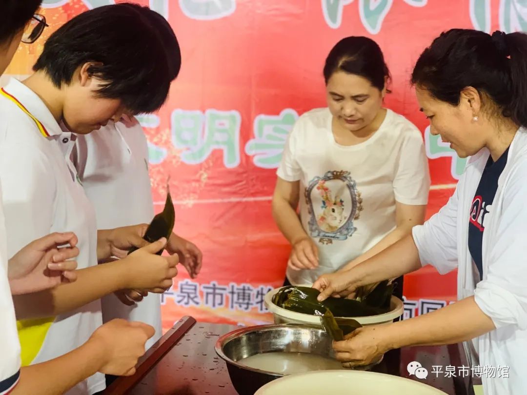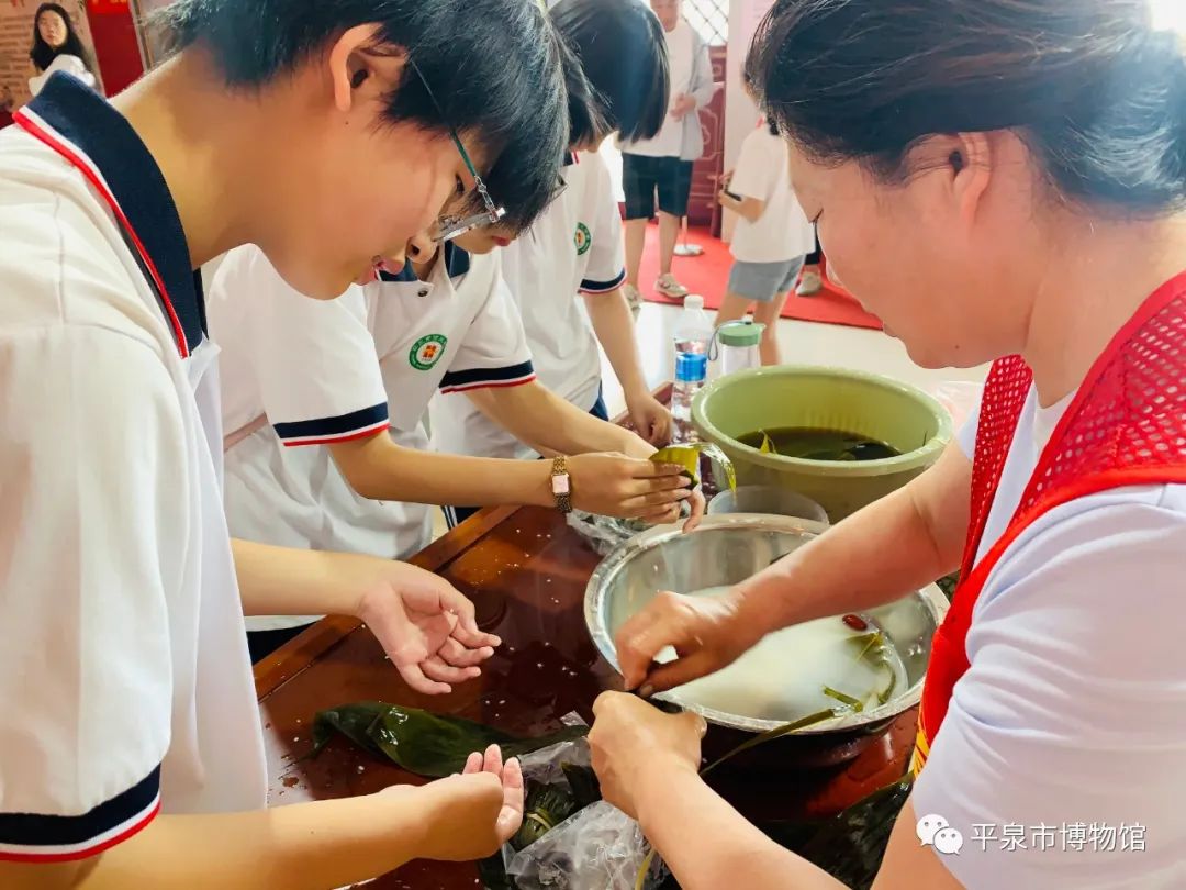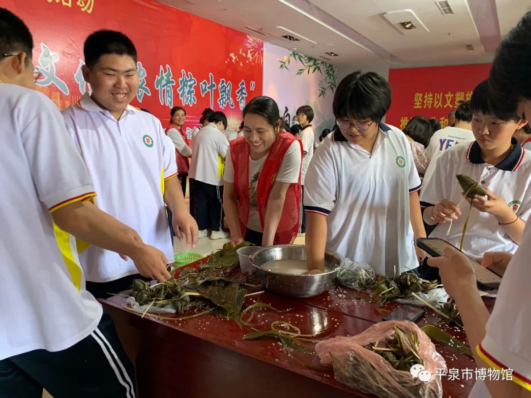 6月22日上午9:00,平泉市回民中学的20名学生由2名老师带队来到平泉市博物馆二层参加了端午活动——包粽子。