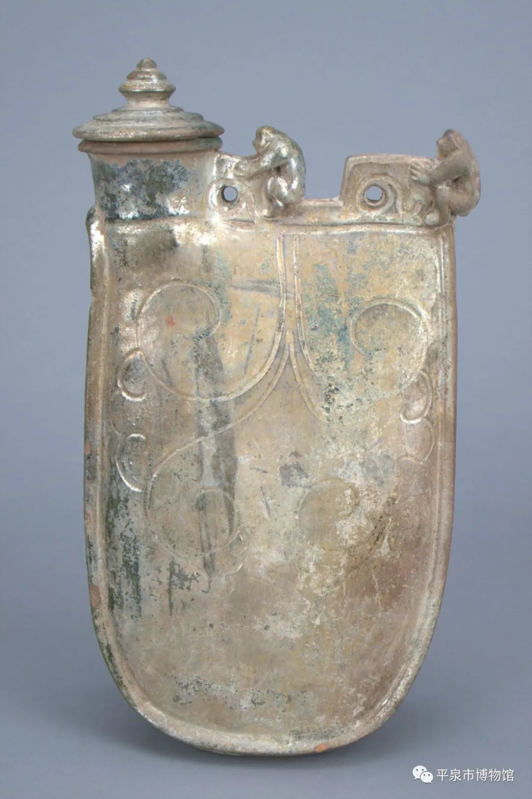 器物描述:壶,扁体,短直管状口,上有盖,旁有双孔系,呈凹字形。两系后各塑一攀援状的小猴。平底内凹,壶身两侧各有棱角突出的曲线仿皮囊缝合痕。器身满挂绿色铅釉至足底。釉面有金属光泽。泥质胎,质松软,为低温釉陶。器身两侧阴刻卷草纹,刀法娴熟流畅。整个器物给人以典雅华贵之感。属辽陶瓷中之姣姣者。