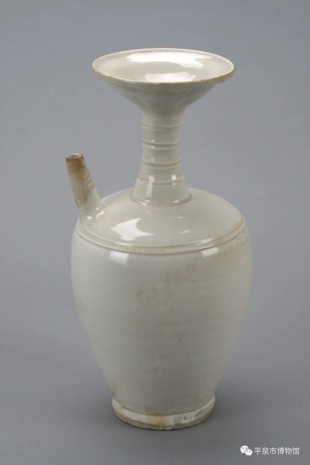器物描述:壶,釉色灰白,盘口,颈呈竹节形,短直流,圆肩,腹壁较直,肩部有弦纹一周。圈足稍侈,足底有旋削痕。这件注壶实用,壶体修长秀美,釉色晶莹,不失为辽白瓷中之精品。反映了辽代制瓷工艺受中原的影响,已到了日臻成熟的高水平。