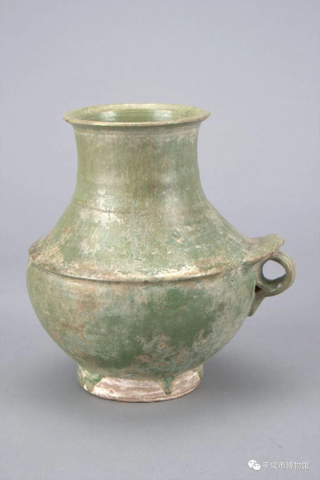 一周,施浅绿釉至足上部,釉可见细小开片,釉面可见垂泪痕。胎,白色为泥质,属低温釉陶,应为冥器。这件单鋬壶造型新巧,别具匠心。