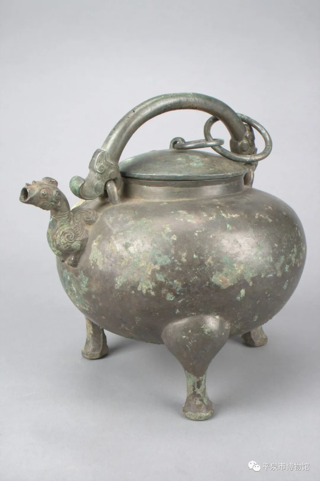 器物描述:盉身作扁圆体,子母口,流在肩部斜上出,造型为趴卧状神兽前身。提梁呈方形,两端以龙首作装饰。盖隆起,顶部有一环形钮,连接一大一小两个圆环,大环连接提梁。三蹄形足,盖及腹部均嵌方形或长方形小铜片。盉通体呈青灰色,平整光滑。底部有烟熏痕。