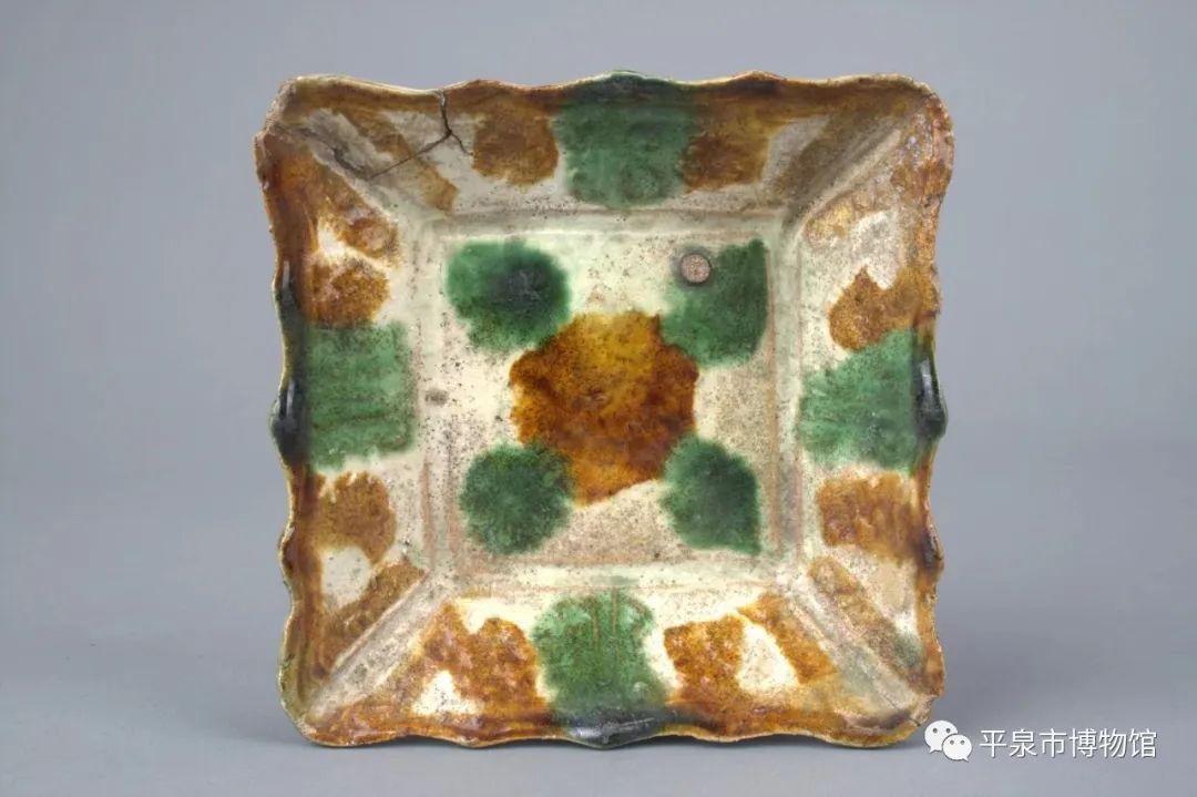 器物描述:盘方形,平底,侈口,曲边。盘内白釉为底,饰黄、绛色花纹。盘底及四角、盘壁中间和曲边沿饰凹弦纹。盘外壁挂釉至足以上,釉色浓艳,有光泽。胎粉红色,施粉白色化妆土。盘内心处有一支钉痕。