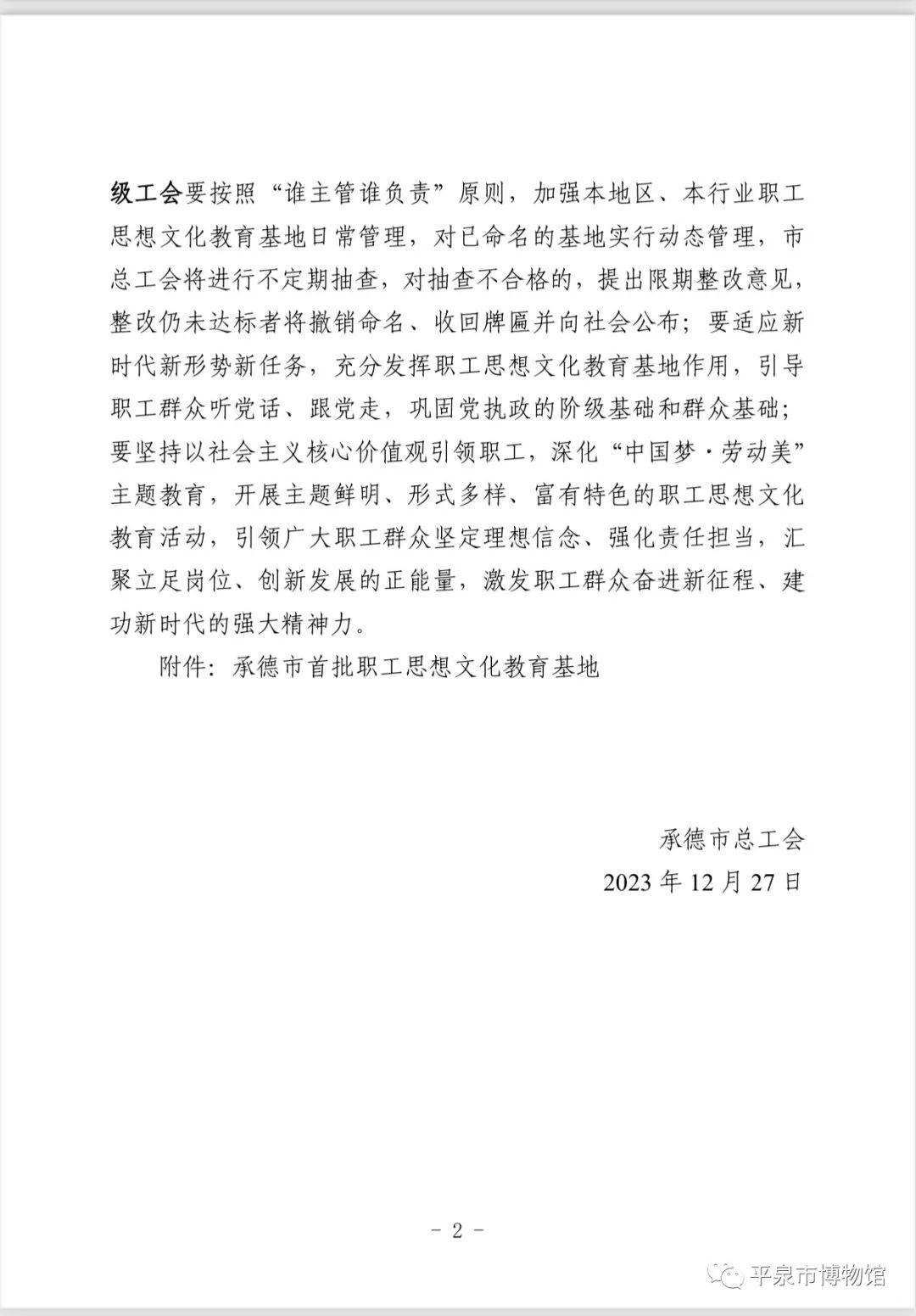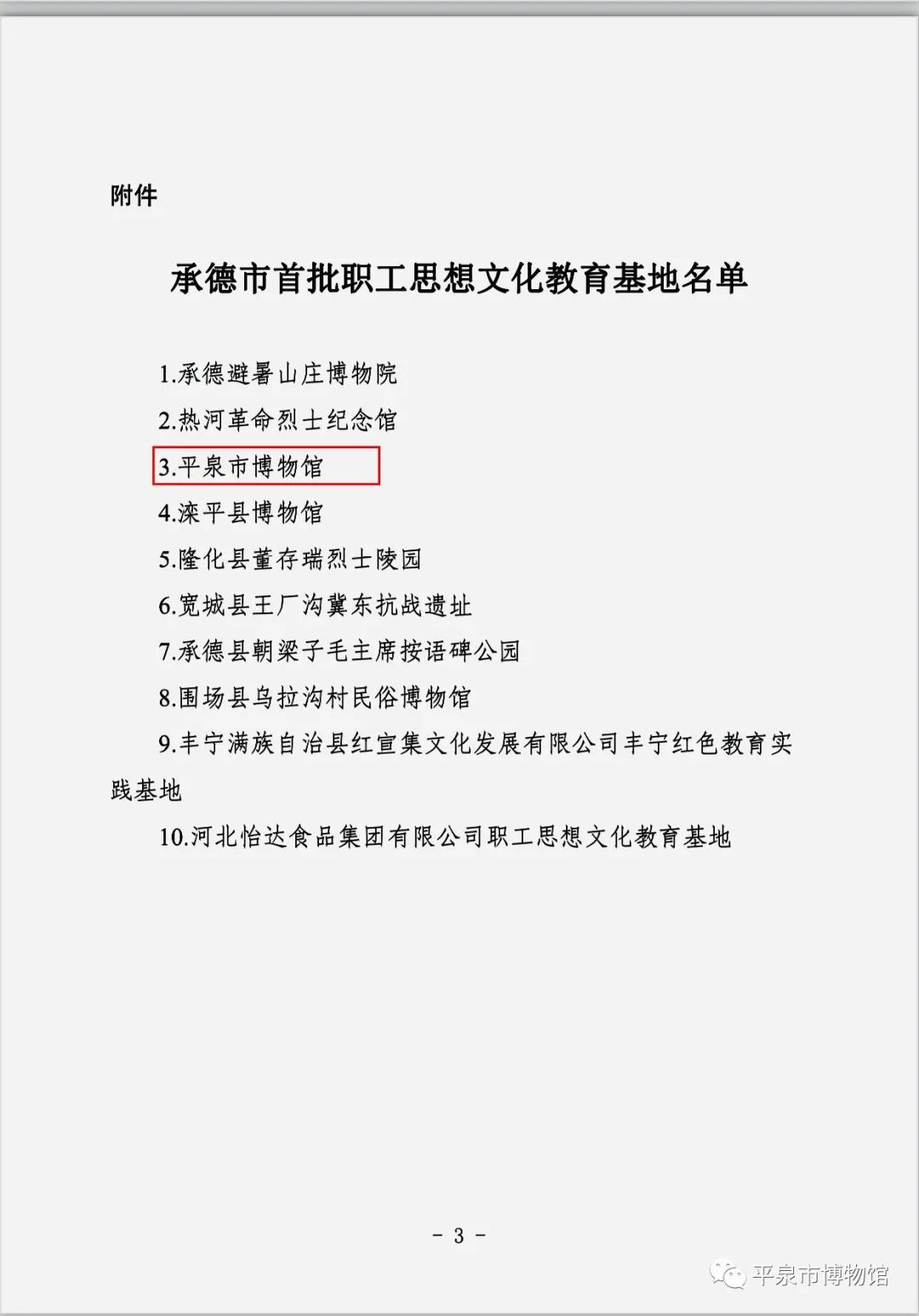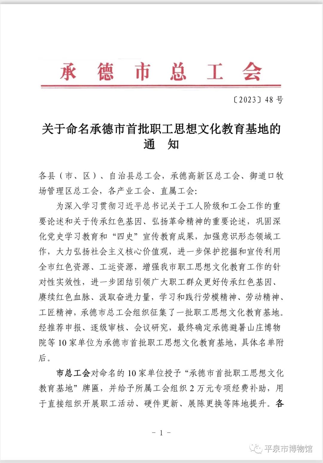 2023年,承德市总工会组织征集了一批职工思想文化教育基地。经推荐申报、逐级审核、会议研究,最终确定10家单位为承德市首批职工思想文化教育基地,平泉市博物馆名列其中。市总工会对命名的10家单位授予“承德市首批职工思想文化教育基地”牌匾。