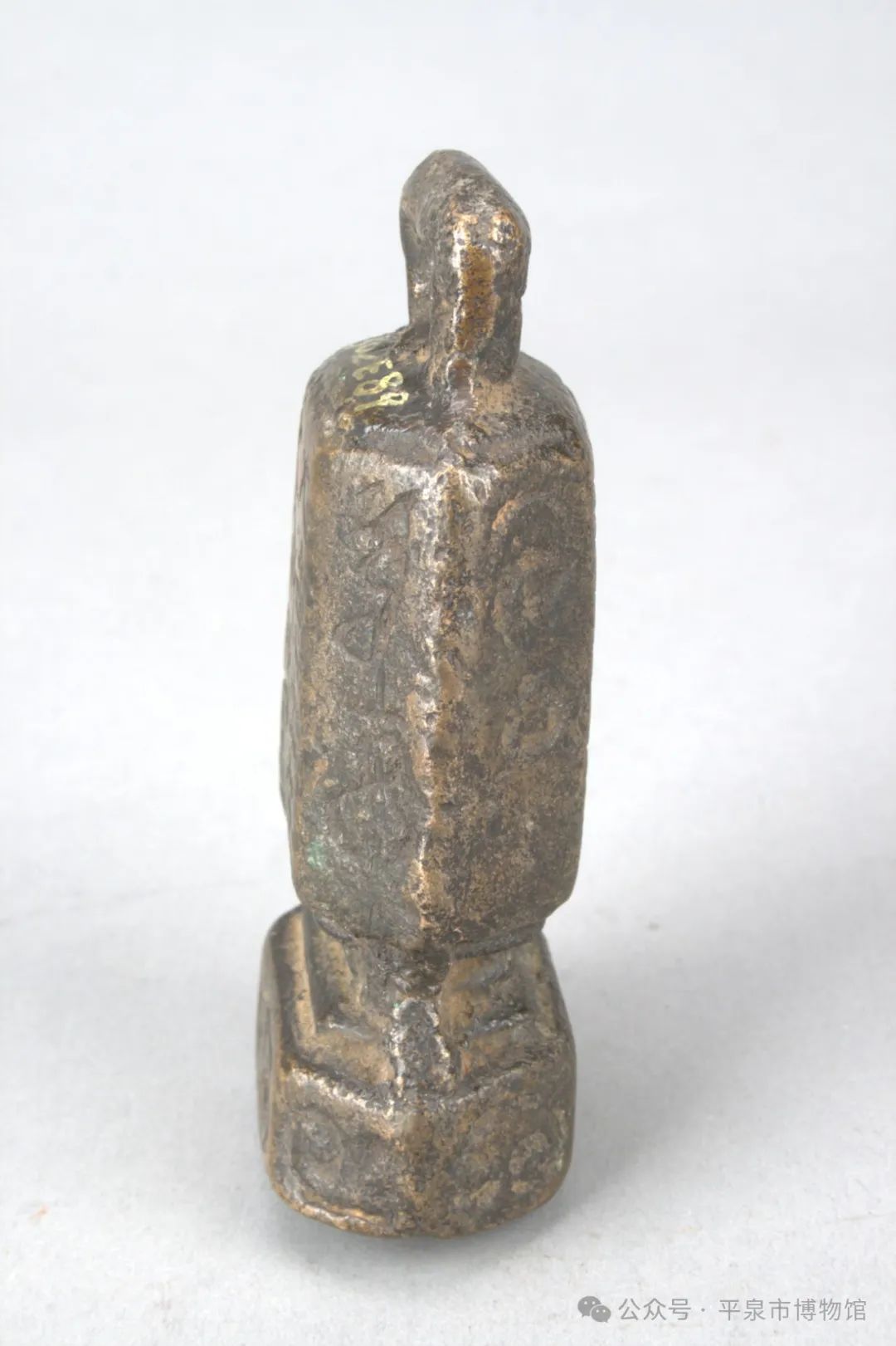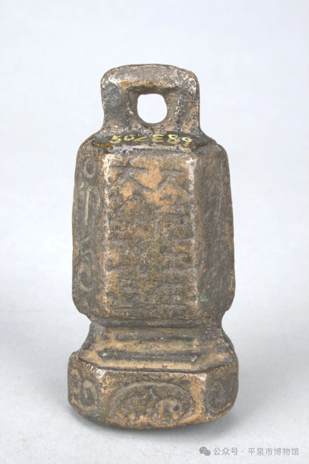 器物描述:权作六面体,平底,方环钮,腹呈六面体形。通高10.6厘米,正面阴刻“大德元年,大都路造”两行八字。背面刻“五十五斤秤”和一行蒙文,其余四面及底部均刻蒙文。