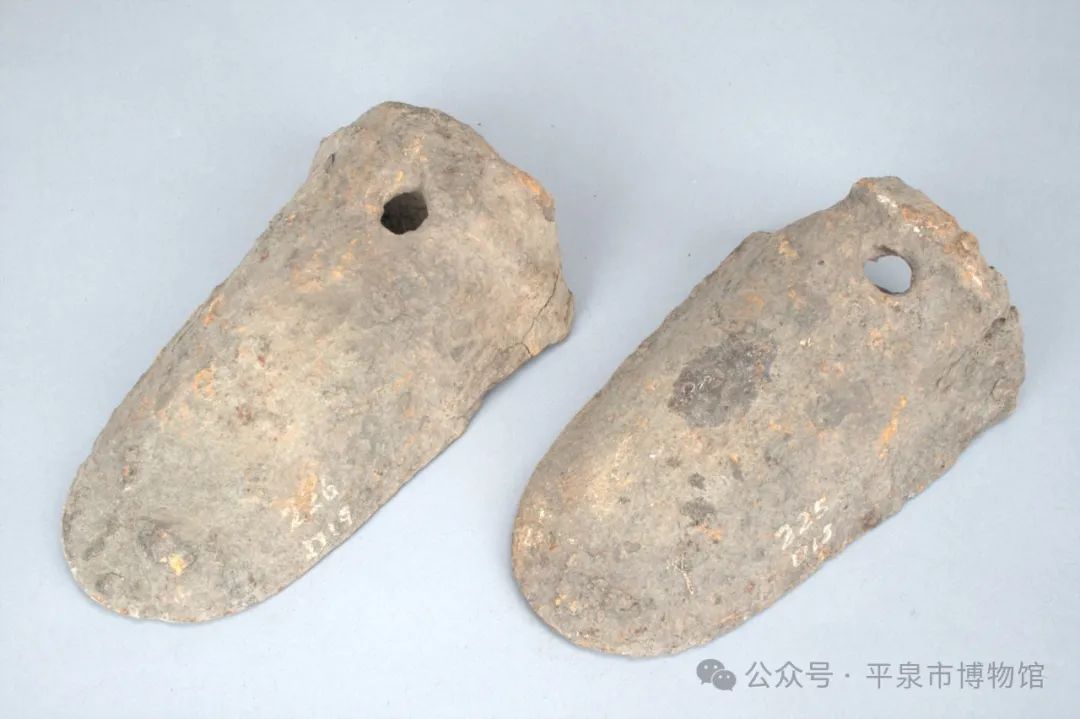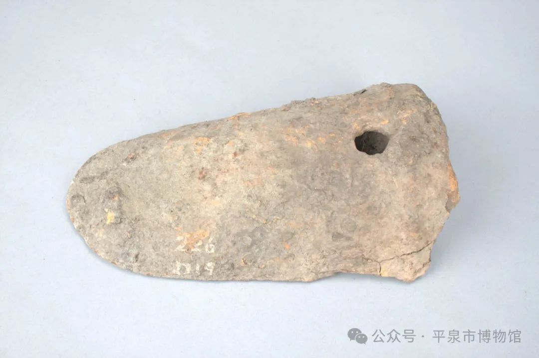 器物描述:耧足整体为足形,平底,弧刃,上有一圆形穿孔,半圆形銎。全长19.7厘米,宽11厘米,銎高6厘米。