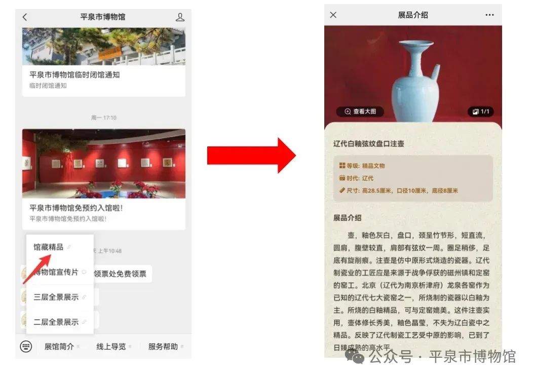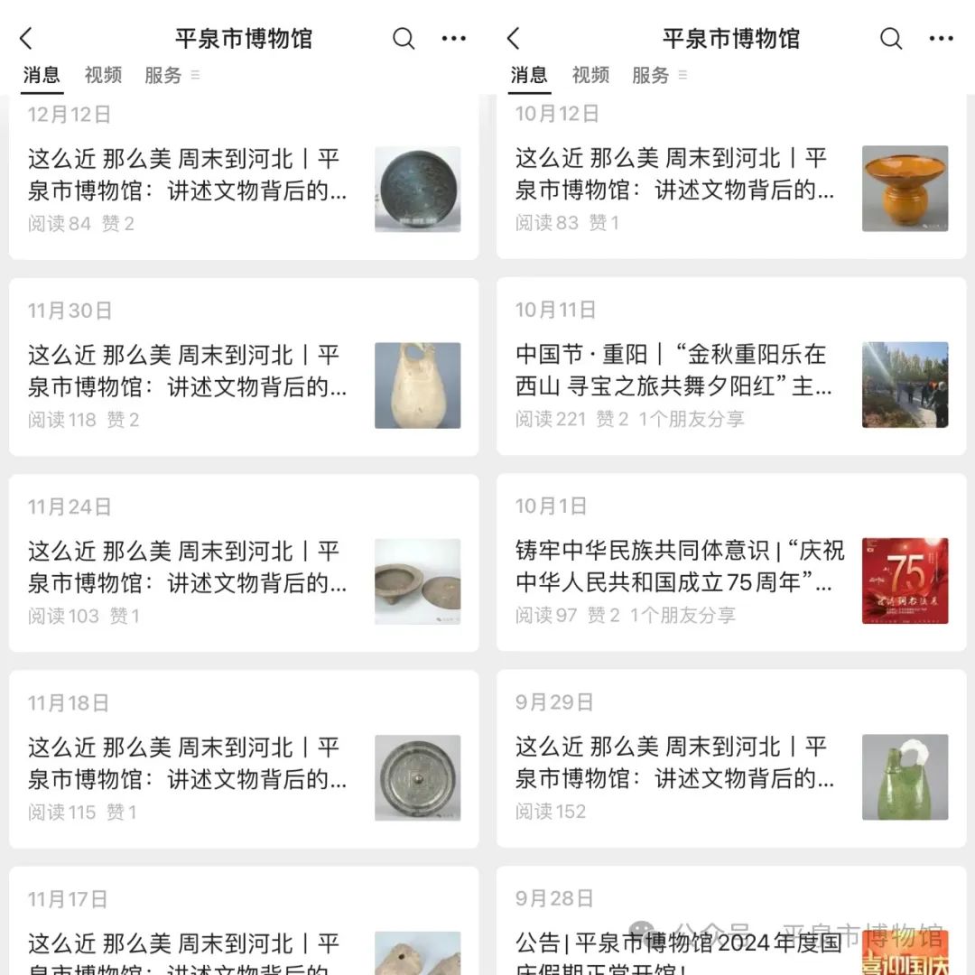 为了更好地回应时代之变、人民之需,“平泉市博物馆”官方微信公众号也不断进行内容与功能的扩充升级,承担起教育传播与宣传建设的重要作用,依托丰富的馆藏资源与雄厚的学术积淀,借力多元化的新媒体展现形式,为观众带来数字化的观展体验与教育资源,丰富人民高品质文化生活,并展示中华文明的悠久底蕴与时代风采。