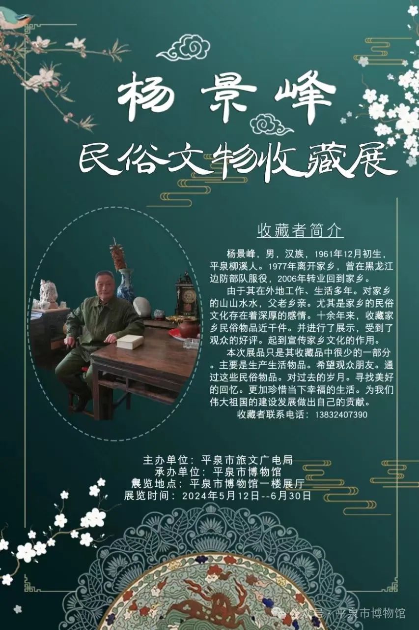 临展三:展期:5月12日-6月30日,平泉市博物馆一楼南展厅举办《杨景峰民俗文物收藏展》,展期50天。