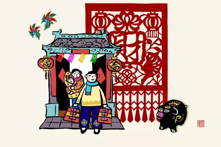 欢声笑语、红彤彤的春联、福字