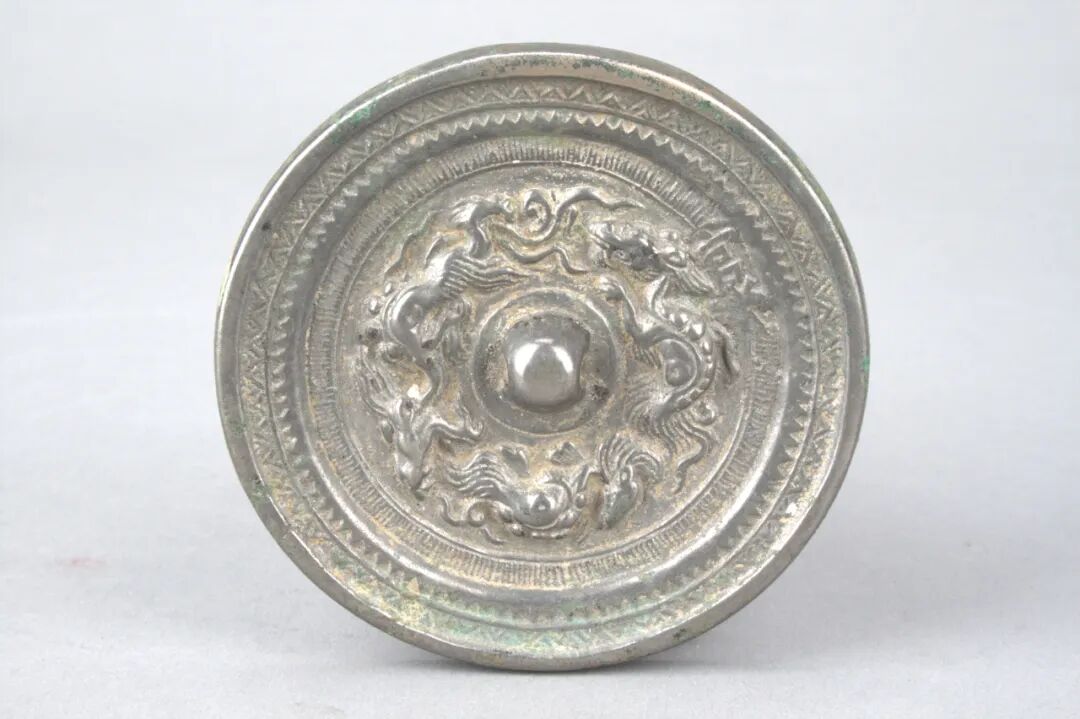 器物描述:镜圆形,球形钮,圆钮座。以一周凸弦纹将镜背分为内外区。内区饰三条腾云鼍龙围绕镜钮。外区饰栉齿纹,中间钮一侧铸有一“官”字。镜缘饰一周锯齿纹和一周双线波折纹,中间夹一周凸弦纹。镜面微鼓,有光泽,斜圆唇。镜体铸造较精细,纹饰清晰。
