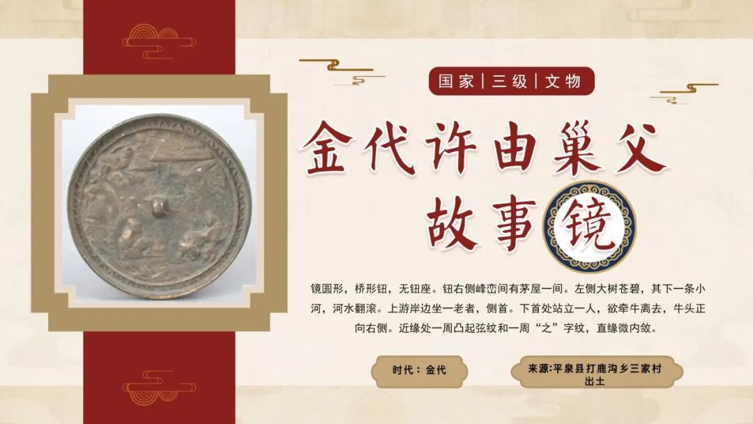 文物是历史的见证,是人类文明的遗产。每一件文物都承载着一段记忆和故事,第八十一期展示的是国家三级文物——金代许由巢父故事镜