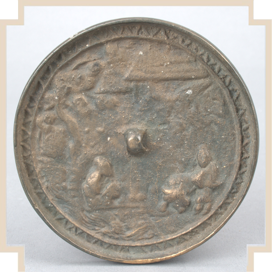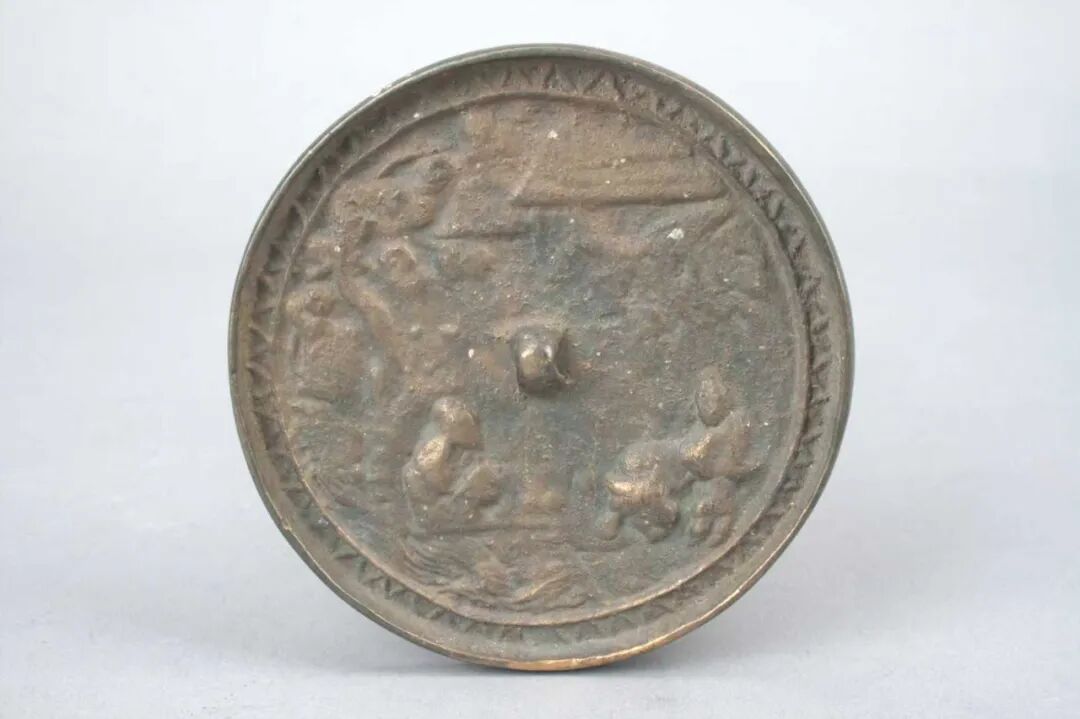 器物描述:镜圆形,桥形钮,无钮座。钮右侧峰峦间有茅屋一间。左侧大树苍碧,其下一条小河,河水翻滚。上游岸边坐一老者,侧首。下首处站立一人,欲牵牛离去,牛头正向右侧。近缘处一周凸起弦纹和一周“之”字纹,直缘微内敛。