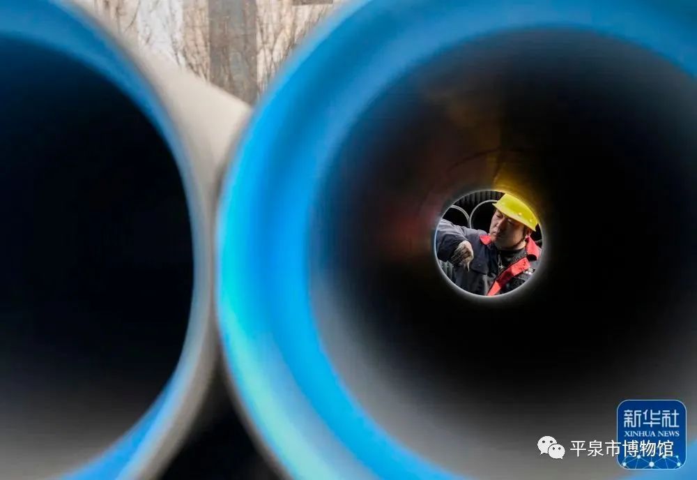 ↑4月2日,在承德县高新技术产业开发区一家环保管材生产企业,工人在检查管材质量。