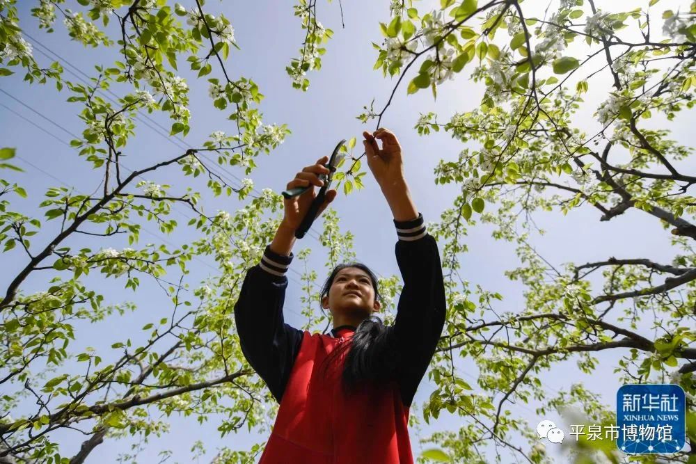 ↑4月21日,承德县新杖子小学学生在老师的指导下学习为梨树梳花。