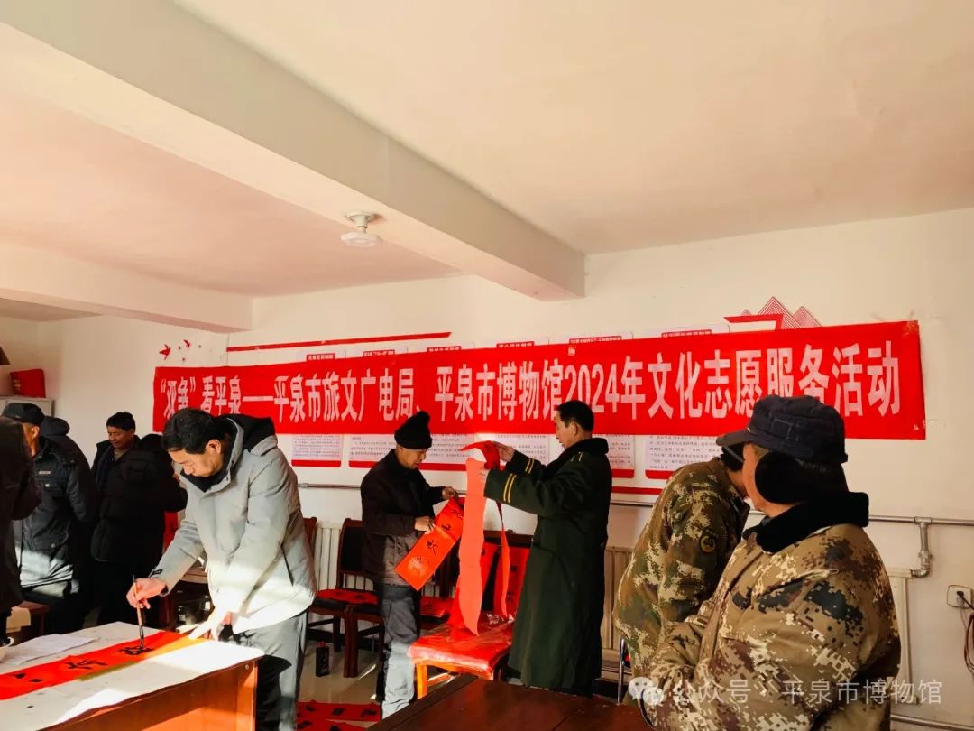 充分发挥社会主义核心价值观涵育基地、河北省爱国主义教育基地、河北省社会科学普及基地、河北省民族团结进步教育基地作用,于2024年1月29日—2月3日期间分别走进道虎沟乡李家梁子村,平泉市博物馆,党坝镇大东沟村,华墅社区,天龙乳业,走进驻军部队,有意义的春联不仅注入文化气息同时带去年的韵味,六次活动共送出千余幅春联和福字。